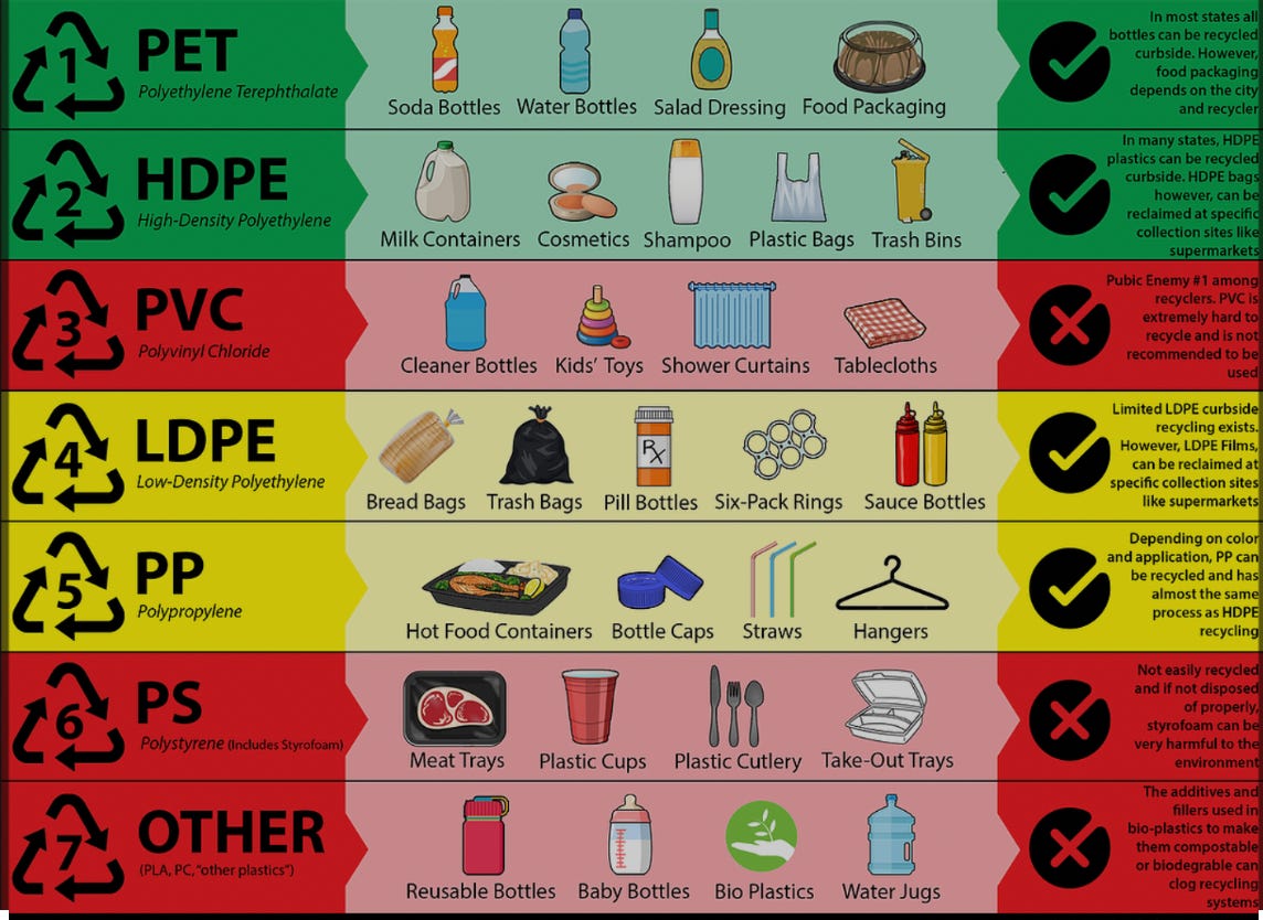Most people are surprised to learn that there is a seven digit coding system indicating the type of plastic and whether it can be recycled.